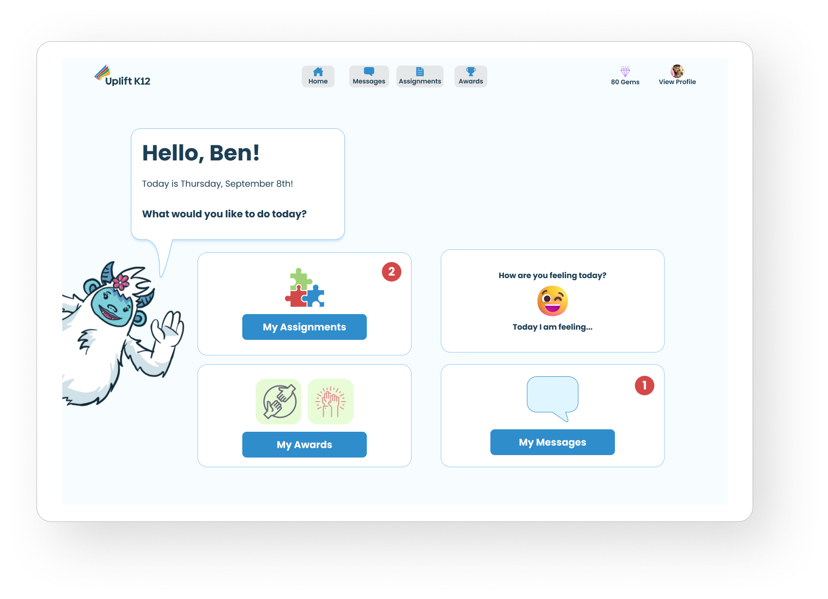 Uplift K12's branding included a yeti mascot that appears upon signing in. Our goal was to incorporate the mascot throughout the platform to create a sense of fun and familiarity for students. By using the mascot in various ways, such as introducing new concepts or reinforcing important information, we aim to enhance student engagement and motivation in the learning process