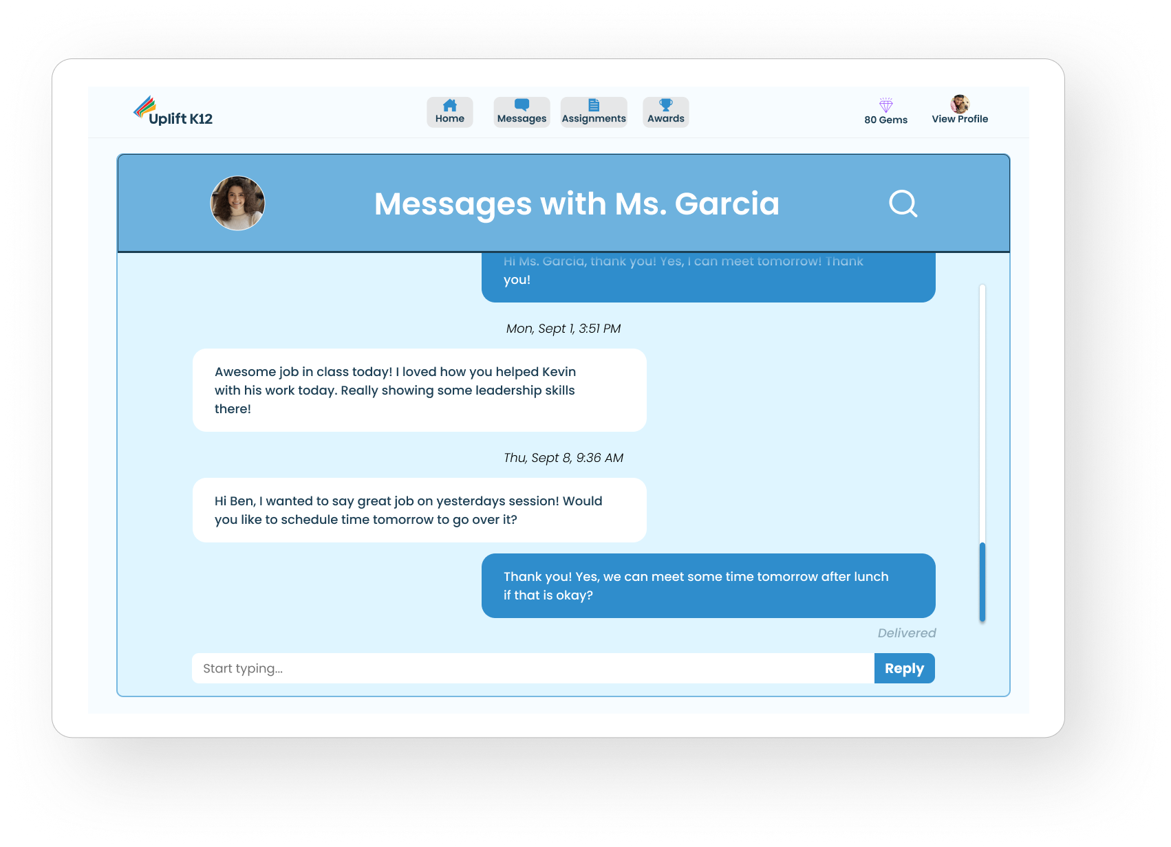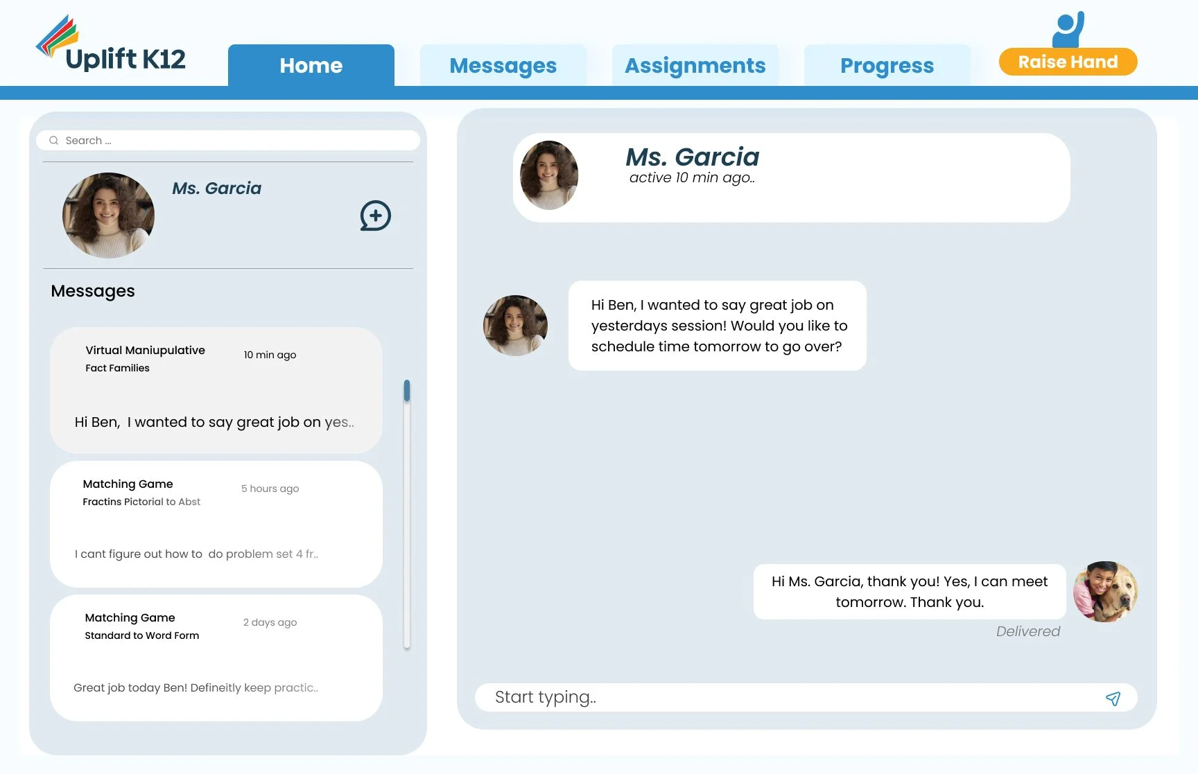 Our Messages page allows students to directly message their teachers. Students can ask their teacher for help and schedule extra support sessions. Our research showed that many students are hesitant to ask questions in class due to the possibility of feeling vulnerable in front of their peers and the potential for bullying. Therefore, a message center was very important to us as it provides a safe space for students to communicate with their teachers.