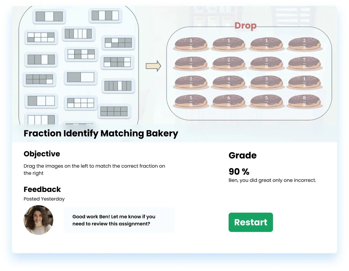 Our assignments page allows students to view past assignments and review their strengths and weaknesses. They can also see any direct comments from their teachers. Additionally, they have the option to redo any assignments, whether it be for practice or simply for enjoyment, allowing students to take control of their learning.